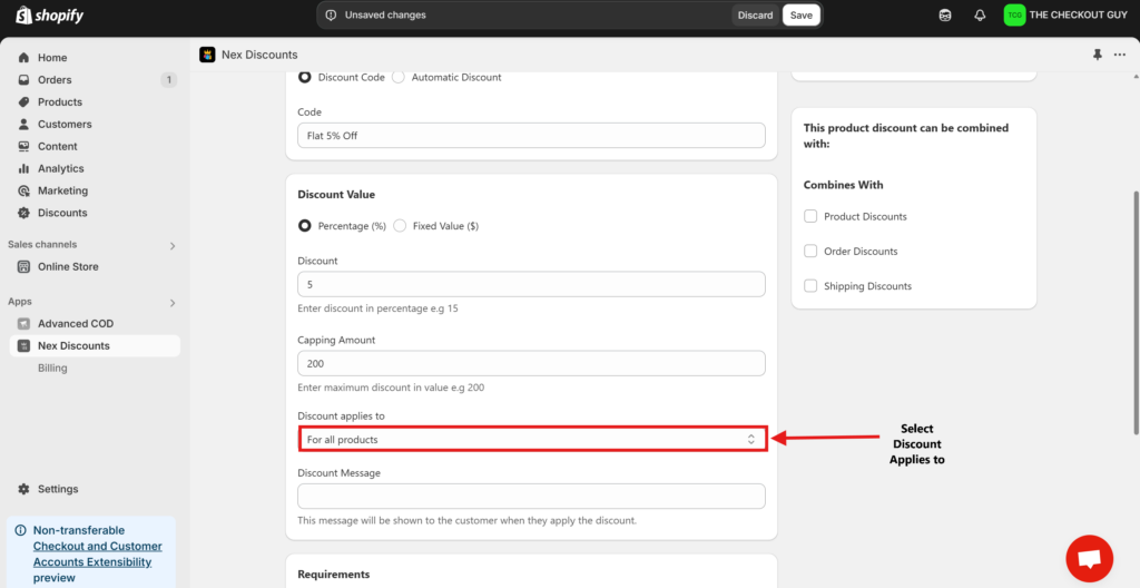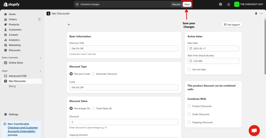 You’ve successfully set up a Discount Code with a Maximum Cap for All Products in Shopify using the Nex Discount Cap & Limit Shopify discount App. Customers can enter the code at checkout to get 5% off, but the discount will never exceed ₹200, ensuring controlled promotions.