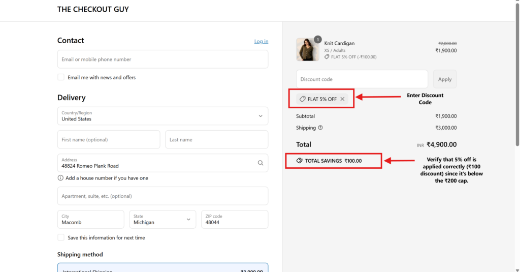 - Verify that 5% off is applied correctly (₹100 discount) since it’s below the ₹200 cap.
