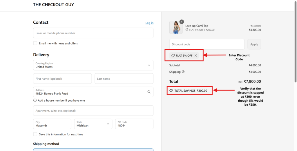 - Verify that the discount is capped at ₹200, even though 5% would be ₹250.